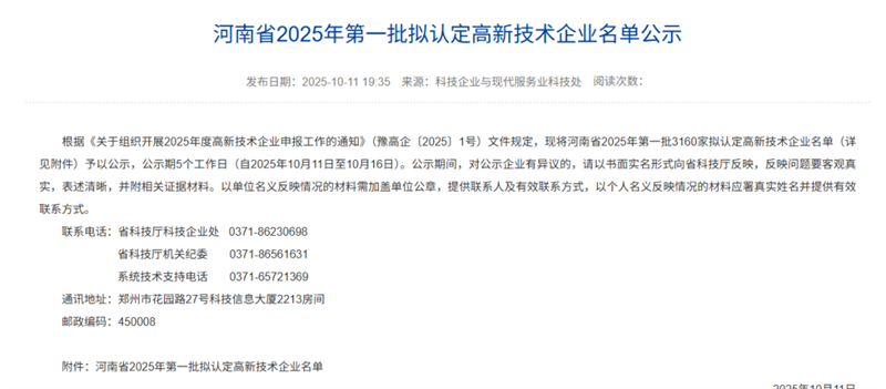 近日,河南省科技厅公示《河南省2025年第一批拟认定高新技术企业名单》。